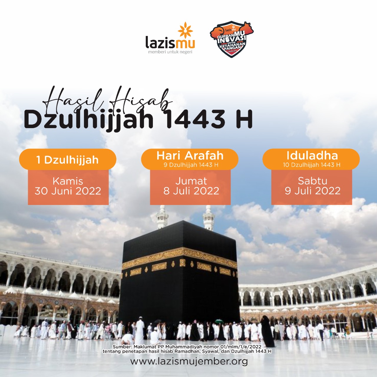 Pimpinan Pusat Muhammadiyah telah menetapkan 1 Dzulhijjah 1443 H, hari arafah dan asyura melalui Maklumat no 01/MLM/i.0/E/2022 tentang penetapan hasil hisab Ramadhan, Syawal, dan Dzulhijjah 1443 H.